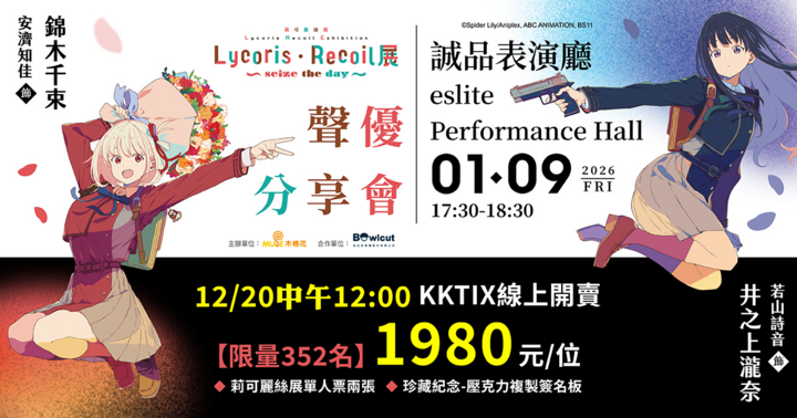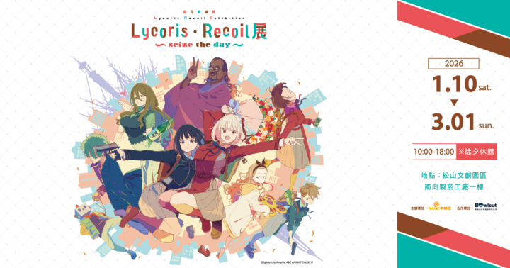 展覽資訊 Lycoris Recoil 莉可麗絲展~seize the day~ 展覽地點|松山文創園區 南向製菸工廠1F 展出期間|2026/01/10(六) - 2026/03/01(日) 開放時間|10:00-18:00(除夕休館),每日最後入場時間17:30 主辦單位|木