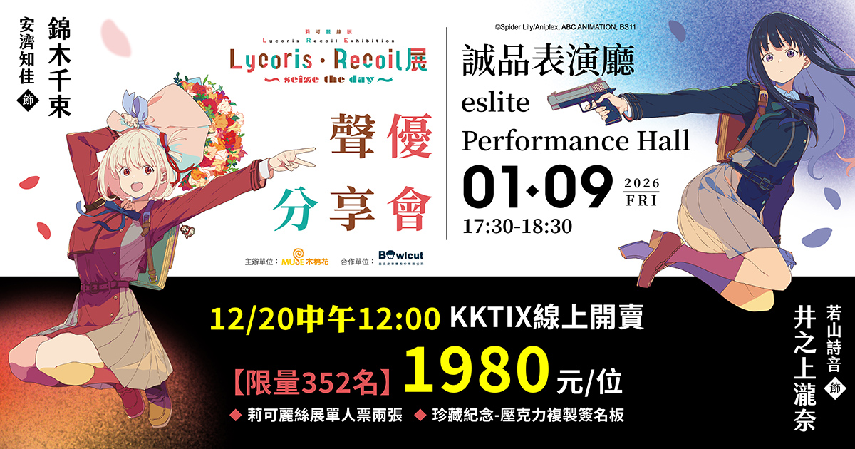 邀請動畫作品《Lycoris Recoil莉可麗絲》兩位主角的聲優飾演「錦木千束」的安濟知佳、飾演「井之上瀧奈」的若山詩音跨海來台與粉絲交流。